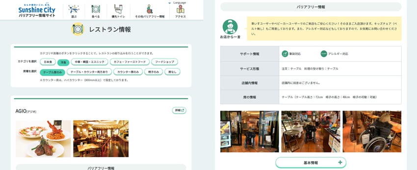 レストランページでは、カテゴリ選択の他に、『席種』として「テーブル席のみ」「カウンター席のみ」などテーブルの情報で絞込みをかけられるようにしています。 これは、車いすユーザーが車いすのまま食事をとることができるかを、すぐに検索できるよう工夫しました。 また、各店舗ごとにサポート情報やサービス形態、店舗内の段差、机・椅子の高さなどの詳細情報を掲載することにより、お客様が安心して店舗を訪れることができるようにしています。